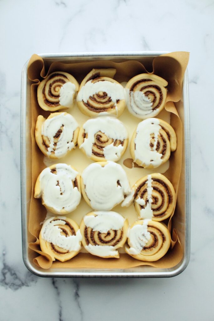 Once the rolls have risen, pour heavy cream over the tops and bake until lightly browned, about 22 to 27 minutes.