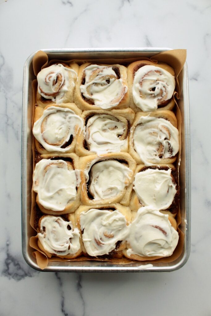 Remove from oven and spread the prepared frosting over warm rolls.