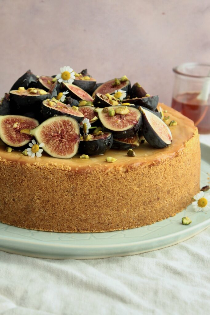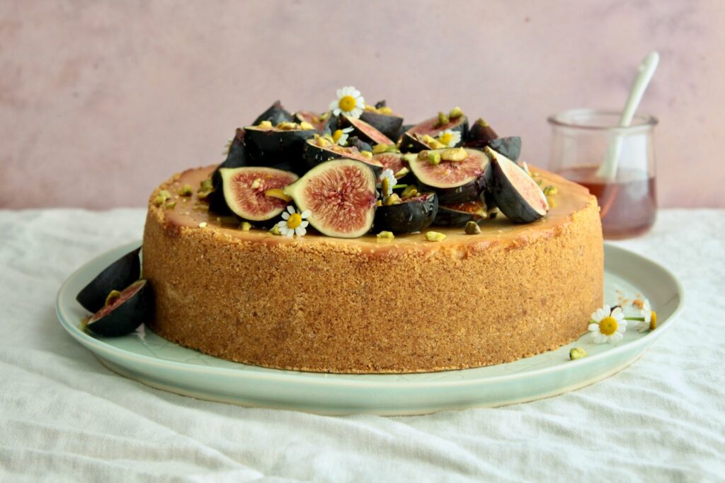 The filling is silky and rich, naturally sweetened with honey and lightly perfumed with orange blossom water, which gives it a soft floral note that feels both cozy and a little bit fancy. Swirls of fig preserves run through the cheesecake for pockets of jammy sweetness, while the graham cracker crust gets a subtle upgrade with a hint of cardamom. Once it’s topped with fresh figs, pistachios, and a drizzle of honey, it turns into a dessert that looks just as beautiful as it tastes.