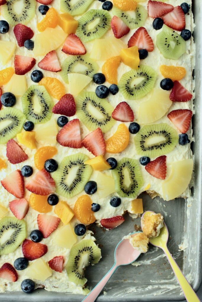 Light, fluffy yellow cake topped with the creamiest whipped pineapple frosting and finished with colorful fruit scattered across the top. It was cool, fruity, and somehow exactly what you wanted after a busy Friday. I bought a slice almost every single week, and I looked forward to it every time.
